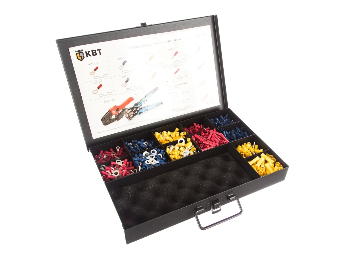 Набор изолированных наконечников КВТ М-950-0 75487 необходим для соединения проводов между собой, а также присоединения их к клеммам электрического оборудования.