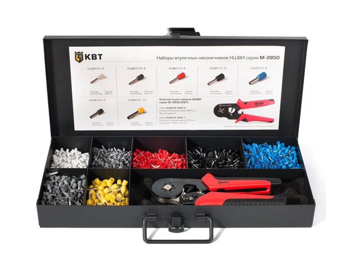 Набор втулочных наконечников НШВИ КВТ М-2850-1 75274 - это комплект для обжима многожильных проводов методом опрессовки. Набор готов к работе, так как помимо втулочных наконечников он поставляется с пресс-клещами.