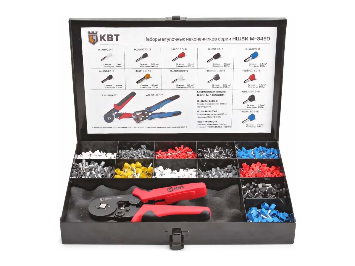 Набор втулочных наконечников НШВИ КВТ М-3450-1 75270 необходим для оконцевания методом опрессовки многожильных медных проводов (одинарных и сдвоенных).