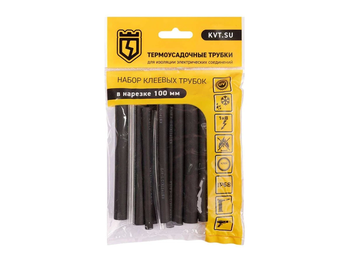 Трубки черного цвета устойчивы к UV-излучению и погодным условиям. Прозрачные трубки гарантируют визуальный контроль контактных соединений после усадки. Инструмент для монтажа: высокотемпературный фен ТТ-1800 или портативные бутановые горелки «КВТ».
