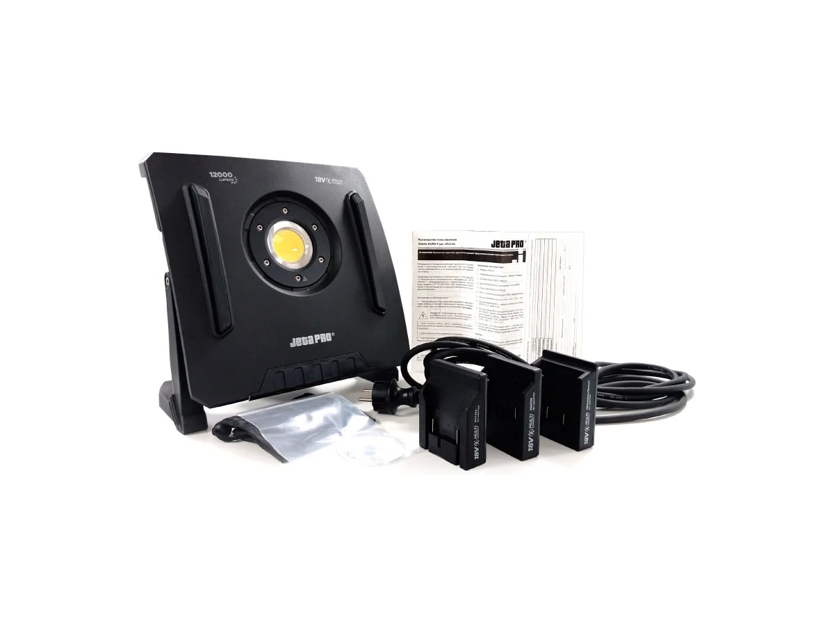 Работает как от сети 100-240V, так и от аккумуляторной батареи, батарея не входит в комплект поставки, только комплект адаптеров для разных видов литий-ионных батарей (BOSCH, Makita, Dewalt, Milwaukee, Metabo).