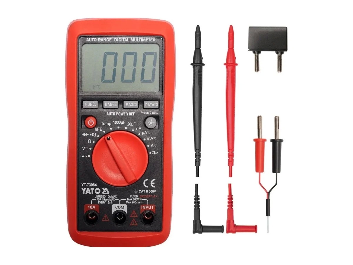 Мультиметр YT-73084 может измерять постоянное напряжение или переменный ток, а также сопротивление, емкость конденсаторов, проверять диоды и измерять температуру. Универсальный измерительный прибор YT-73084 имеет автоматический диапазон, облегчающий и ускоряющий измерение. Кроме того, он позволяет измерять высокие токи до 1000 А с помощью дополнительных измерительных зажимов (продается отдельно).