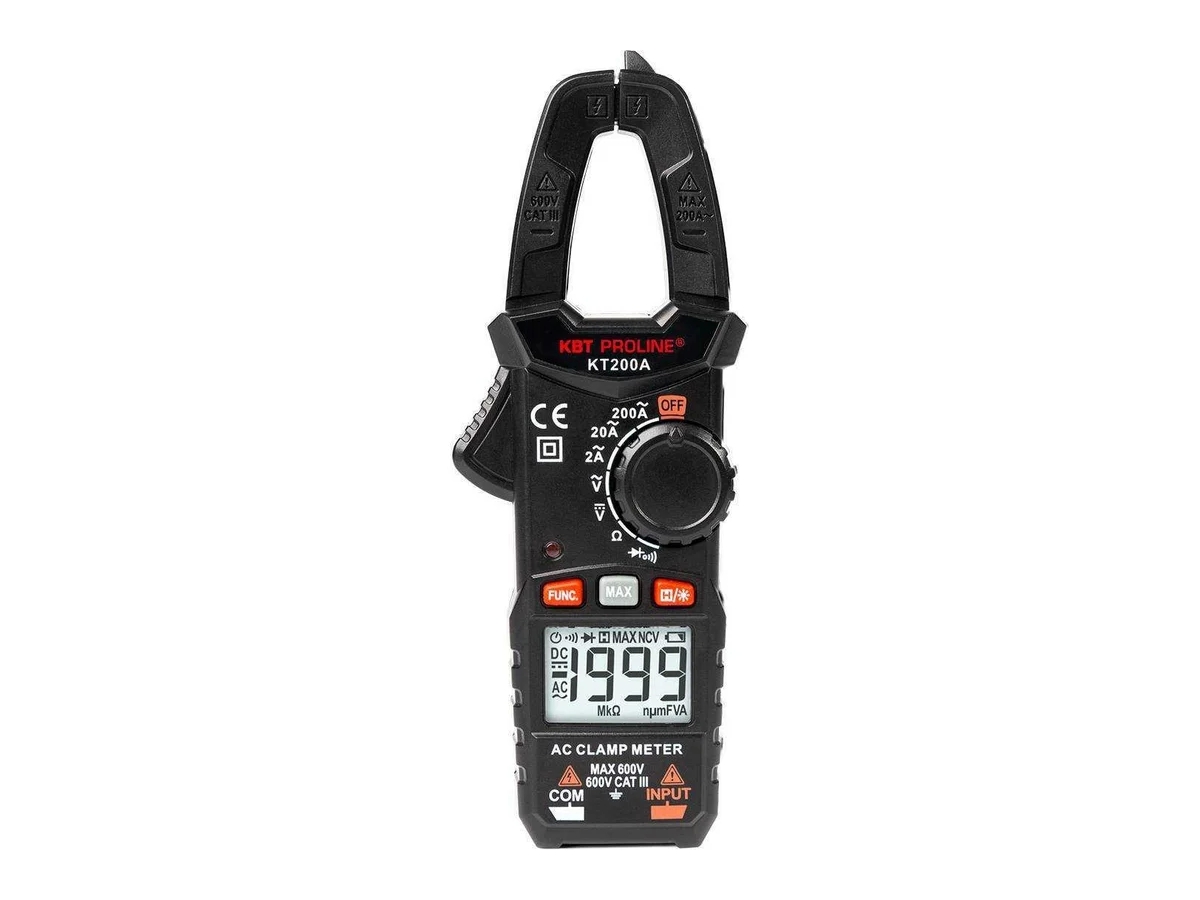 Токовые цифровые клещи КВТ KT 200A PROLINE 79129 – многофункциональные цифровые токовые клещи с автоматическим выбором пределов измерений и световой индикацией безопасности.