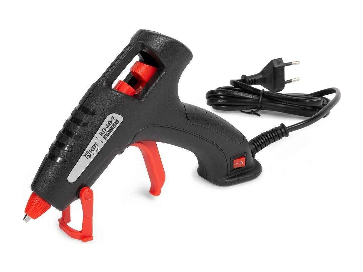 Клеевой пистолет КВТ КП-40-7 87965 предназначен для быстрого и надежного склеивания керамики, фарфора, пластика, металла, кожи, резины, дерева, картона и других материалов с помощью термоплавкого клея.