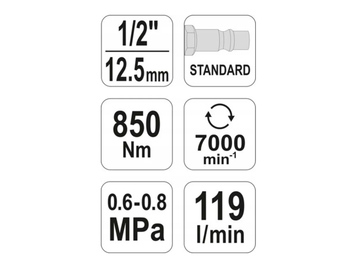 Технические параметры гайковерта YT-09525 таковы: вес равен 2,6кг, максимальный крутящий момент составляет 850Nm, расход воздуха 119 л/мин. Прибор может работать на скорости 7000 оборотов в минуту, привод равен ½.