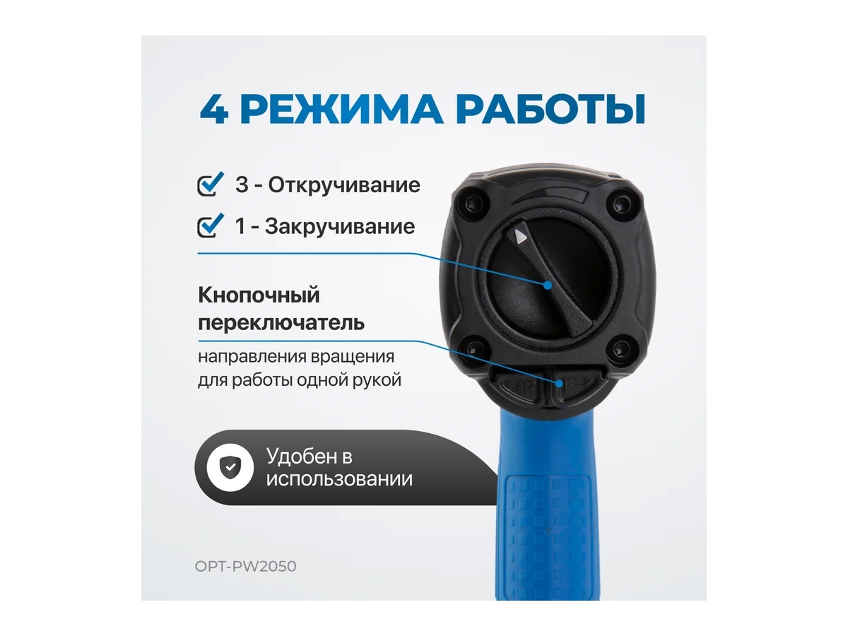 Пневматический ударный гайковерт OPTIMUS OPT-PW2050 с приводным квадратом 1/2? и максимальным крутящим моментом 1600 Нм. Предназначен для проведения монтажных и демонтажных работ с крепежом, работает от источника сжатого воздуха. Используется на СТО, производственных предприятиях, в сборочных цехах. Надежный и долговечный ударный механизм Twin Hammer обеспечивает мгновенный сбалансированный удар и минимальную вибрацию.