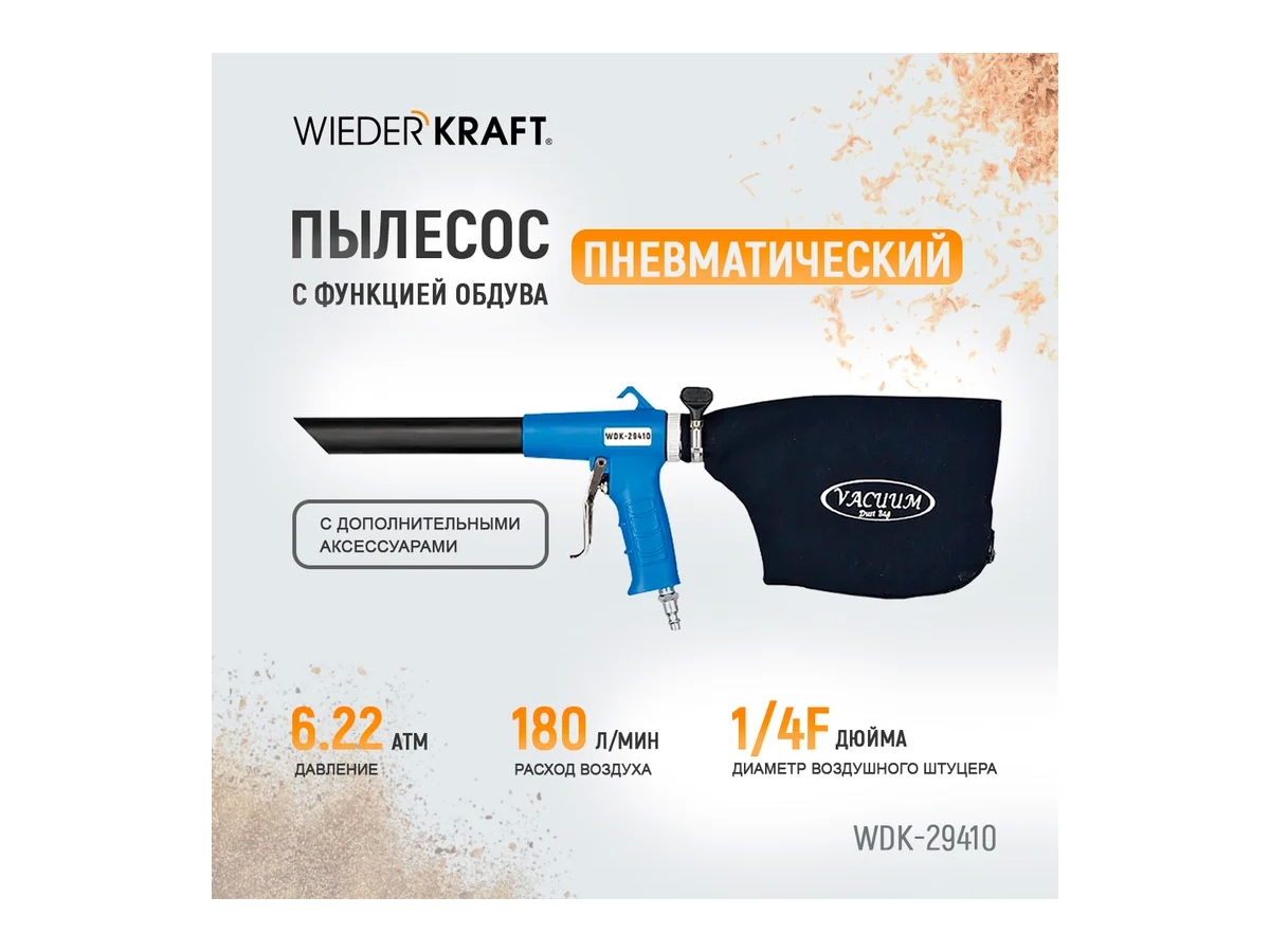 Пневматический пылесос WDK-29410 с функцией обдува предназначен для сбора пыли, стружки и остатков материалов после сверления, зачистных и шлифовальных работ.