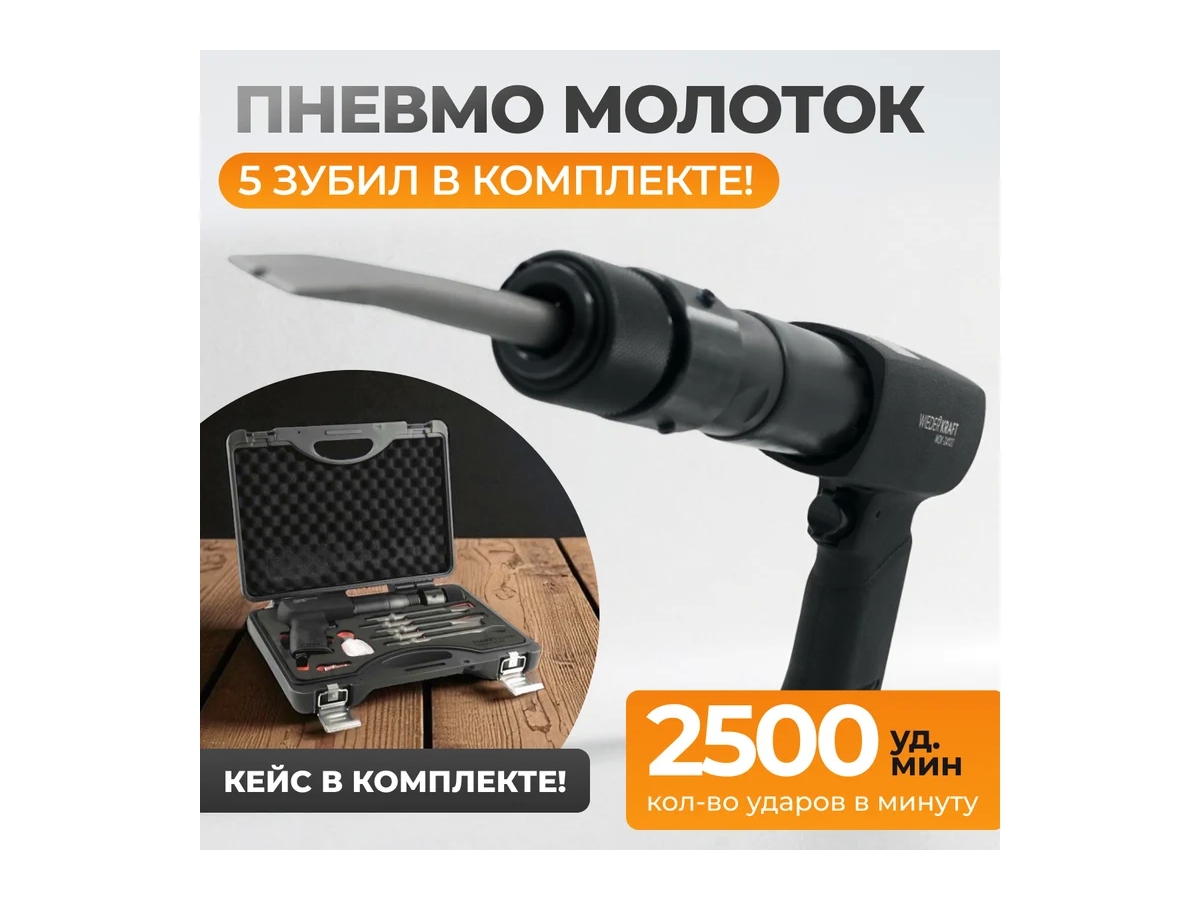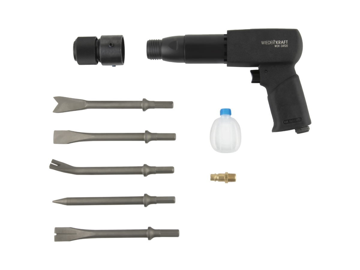 Пневматический молоток WIEDERKRAFT 2500 уд/мин, HEX 175 мм WDK-24120 поставляется в алюминиевом корпусе в комплекте с набором высокопрочных зубил из хромомолибденовой стали, съемным патроном, быстросъемным соединением 1/4" и пневматическим маслом.