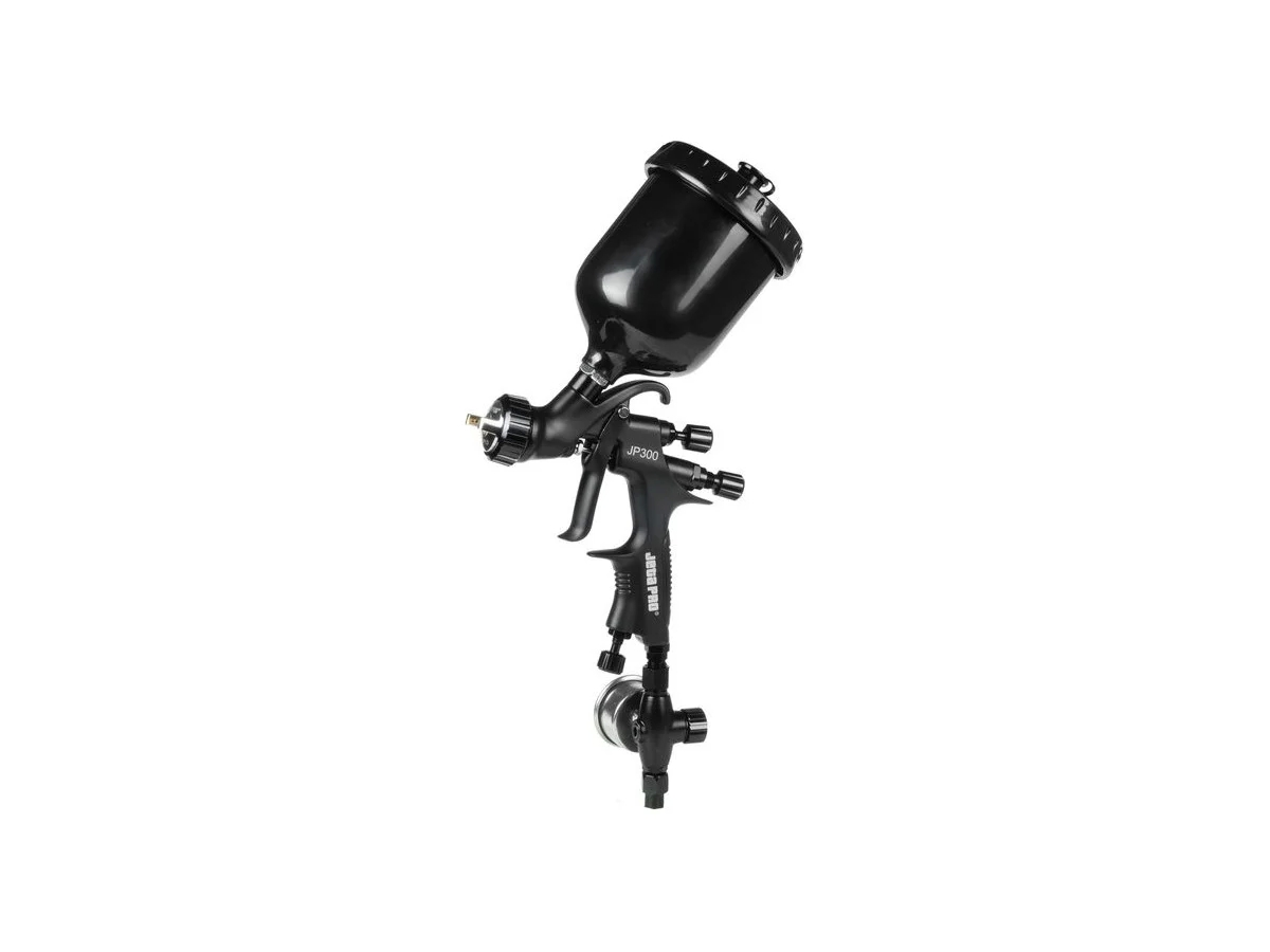 Универсальный краскопульт предназначенный для работ в сфере кузовного ремонта Корпус выполнен из литого алюминия с тефлоновым покрытием, воздушная распыляющая головка из хромированной латуни, сопло и материальная игла из нержавеющей стали. Все прокладки изготовлены из высококачественного материала, устойчивого к агрессивному воздействию растворителей. Прекрасно подходит для нанесения любых лакокрасочных материалов: 1К покрытий, базовых эмалей.