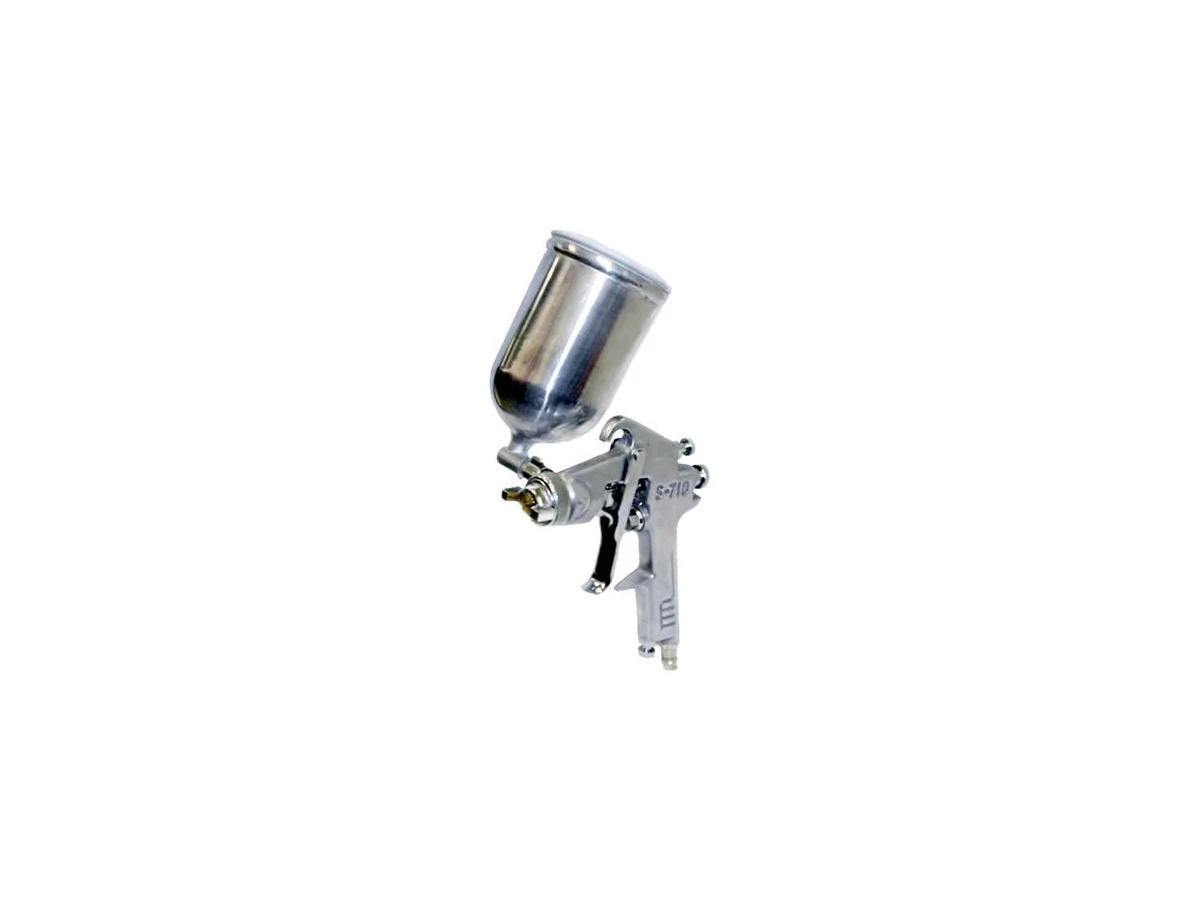 Универсальный окрасочный пистолет с алюминевым боковым вращающимся поворотным бачком конвекционной системы распыления. Рекомендуется для нанесения 1К синтетических красок, различных видов грунтов. Особенно удобен при окраске труднодоступных мест и небольших поверхностей. Имеет регулировку давления воздуха в нижней части ручки пистолета.