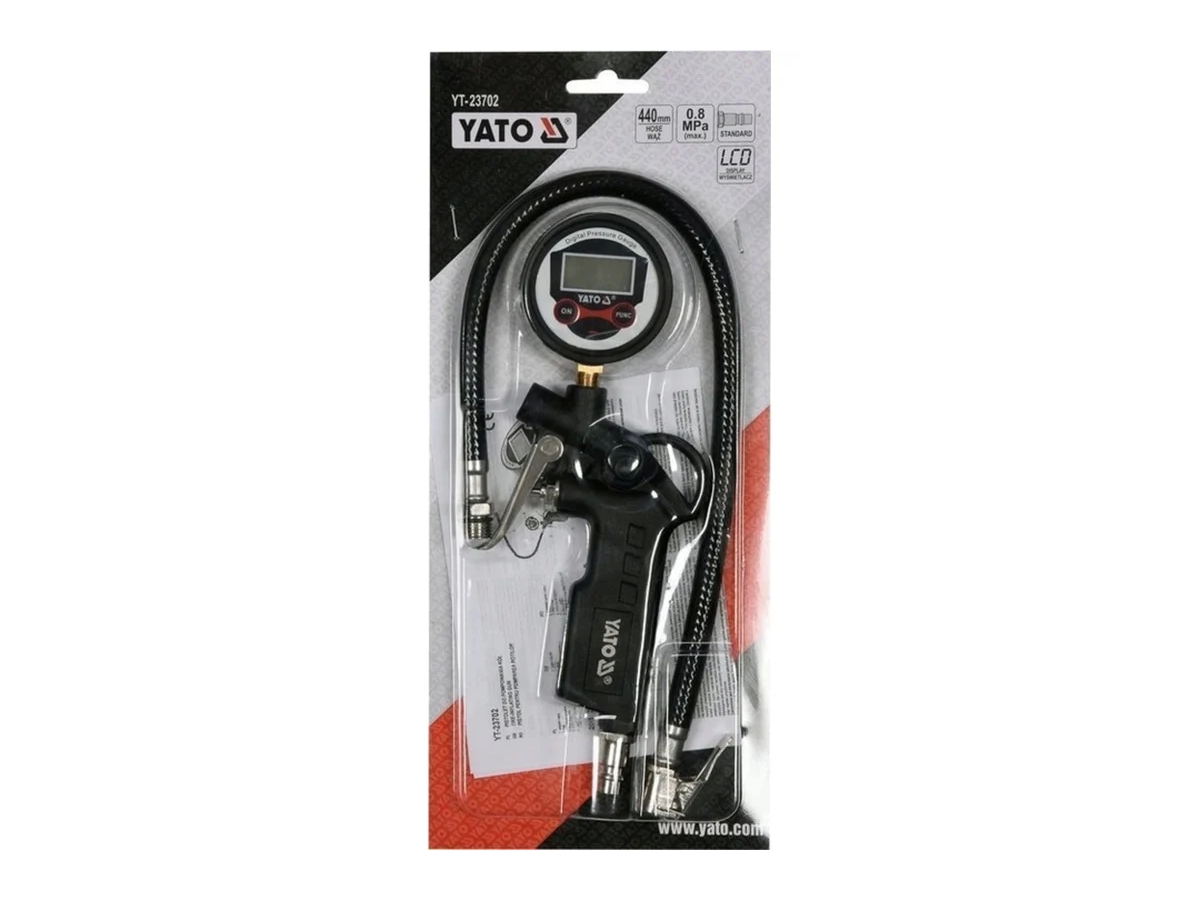 Пистолет для накачивания колес YATO YT-23702 - это профессиональный напорный пистолет с жидкокристаллическим экраном для заполнения шин и камер с помощью клапана сжатым воздухом.
