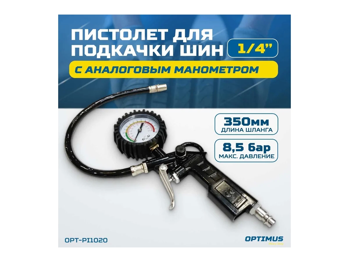 Пистолет для подкачки шин OPTIMUS OPT-PI1020 предназначен для контроля и регулировки давления в шинах. Позволяет не только накачивать шины, но и стравливать избыточное давление.