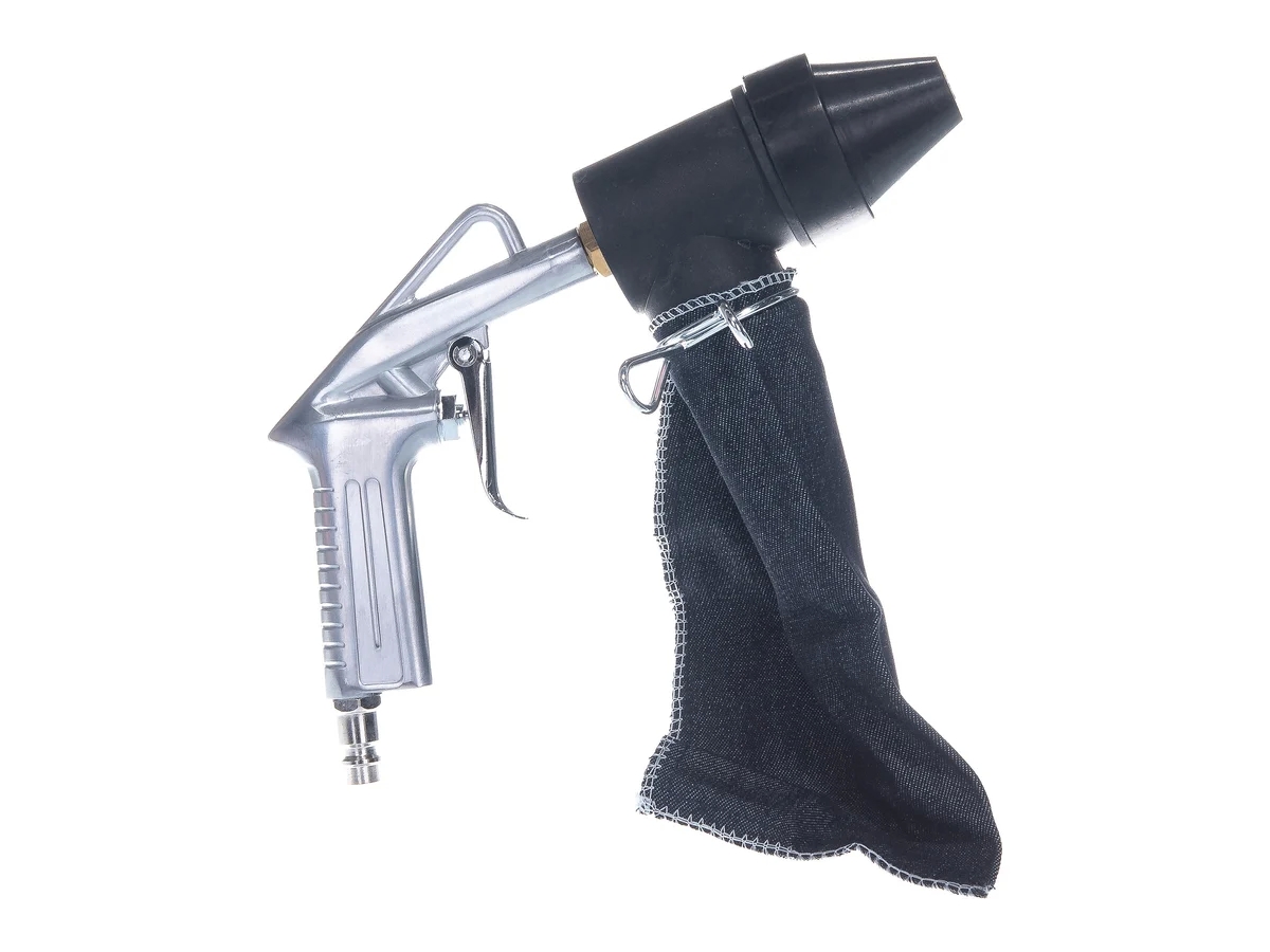 Взятый из мешка и выходящий с большой скоростью абразив после соударения с обрабатываемой поверхностью не разлетается в разные стороны, а блокируется в резиновом колпачке и вместе с выходящим воздухом переносится обратно в мешок с абразивным порошком. Помимо экономии абразива пистолет позволяет проводить обработку «жучков» на ровных и большинстве фасонных поверхностей без применения закрытой спецодежды, которая обязательно требуется при работе с другими видами пескоструйного оборудования. В большинстве случаев достаточно защитных очков, перчаток и респиратора.