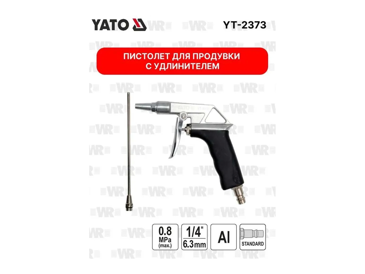 Пистолет для продувки с удлинителем YATO YT-2373 надежен в работе. Применяется для очистки поверхностей и труднодоступных мест от грязи и пыли.