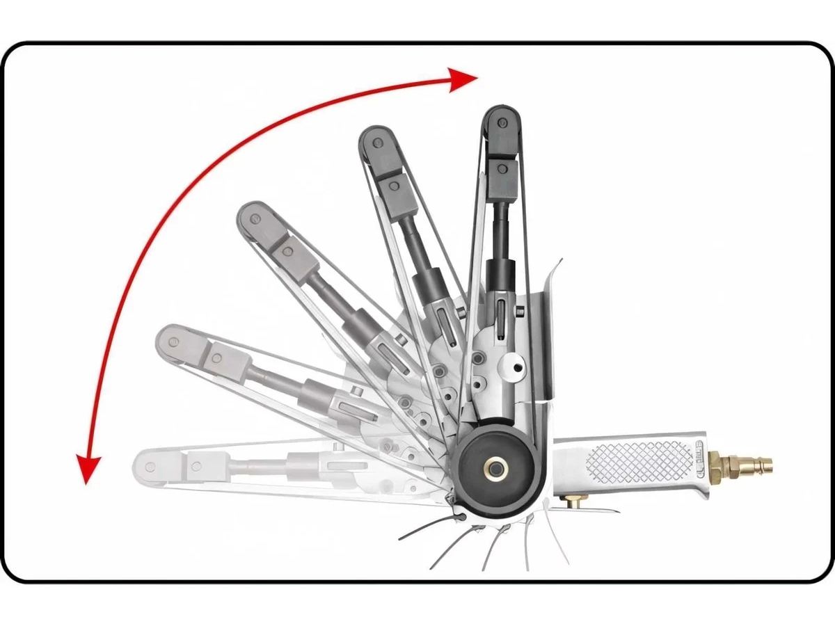 Профессиональная пневматическая ленточная шлифовальная машина. Размер ремня 20х520 мм, рабочая скорость 20 000 об/мин. Воздушное соединение 1/4 дюйма. Рабочая головка регулируется.