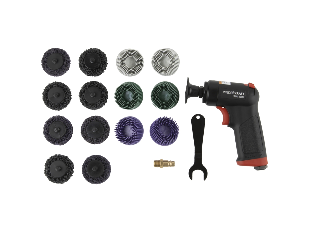Пневматическая шлифовальная машинка WIEDERKRAFT 50 мм, 18000 Об/мин, 380 Вт WDK-25310 с набором абразивной оснастки.