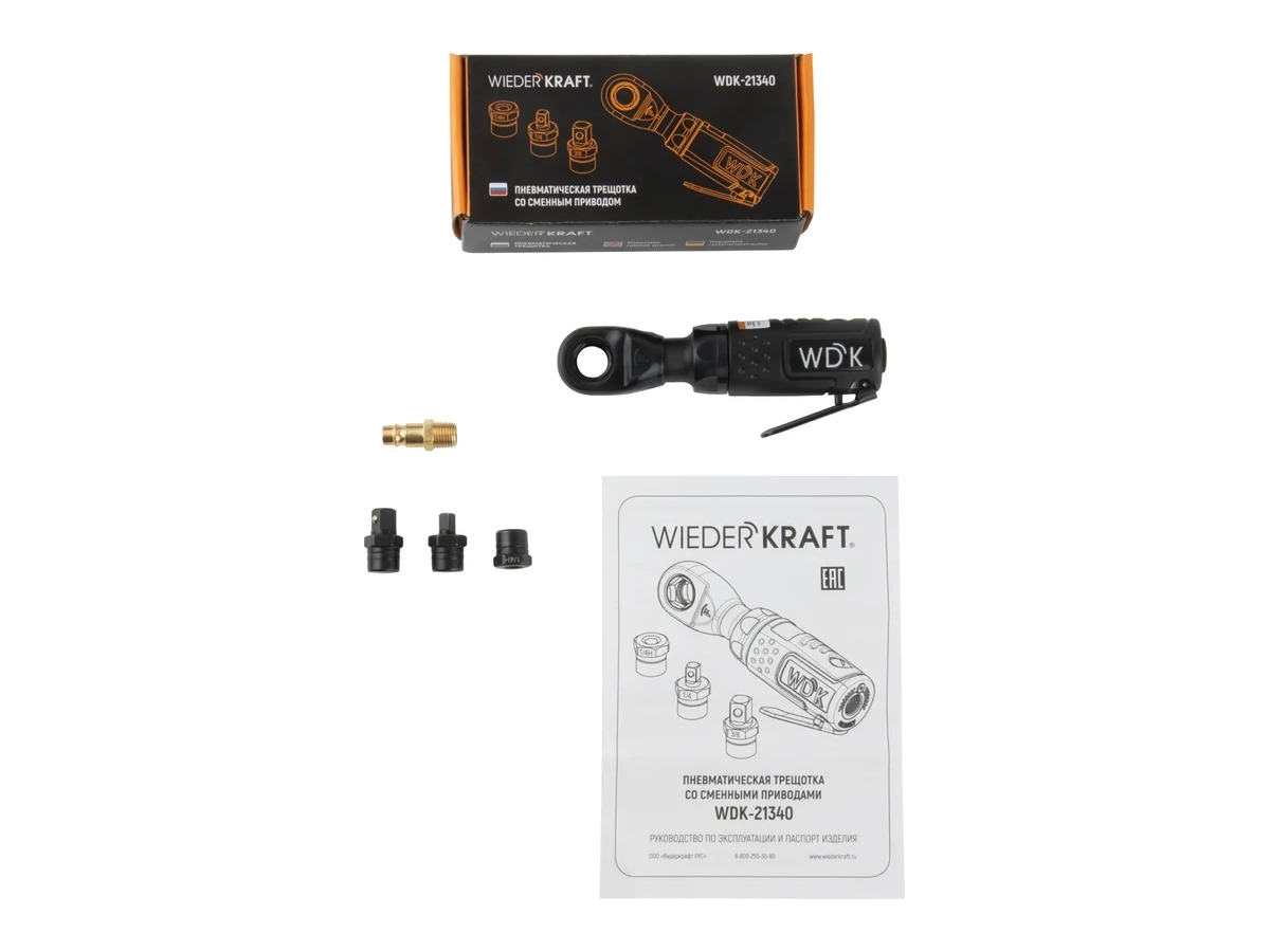 Универсальная пневматическая трещотка WDK-21340 со сменными приводами позволяет работать с размерами под квадрат 1/4", 3/8" и битами с приводом 6.3 мм (1/4"). Открытый внутренний шестигранник 17 мм позволяет работать с длинными шпильками. Ручная затяжка с моментом до 70 Нм. Компактная модель. Средний расход воздуха: 85-100 л/мин.