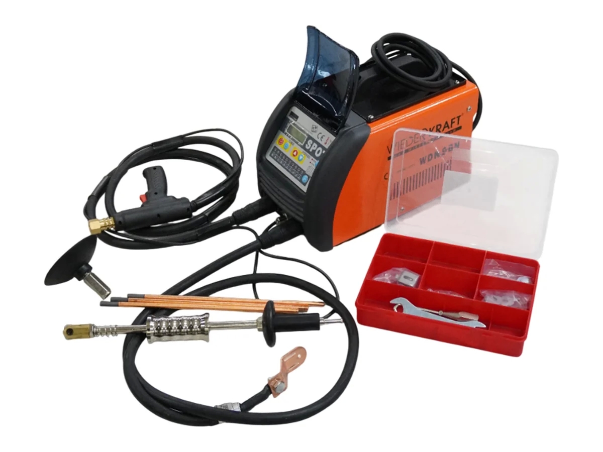 Многофункциональный переносной аппарат WiederKraft WDK-9BN, который предназначен для выравнивания и рихтовки металлических элементов автомобильного кузова (максимальный ток 3800 А). Микропроцессорное управление, понятный дисплей и кнопочная панель обеспечивают полный контроль всех процессов и удобное пользование аппаратом. Все органы управления выполнены из износостойкого пластика. Автоматический контроль с защитой от перегрева предохраняет прибор от преждевременной поломки и продлевает его срок службы. Также на корпусе аппарата имеются отверстия для забора воздуха, необходимого для охлаждения. На верхней панели корпуса располагается эргономичная ручка, благодаря которой споттер легко и удобно перемещать внутри рабочей зоны даже без использования тележки.