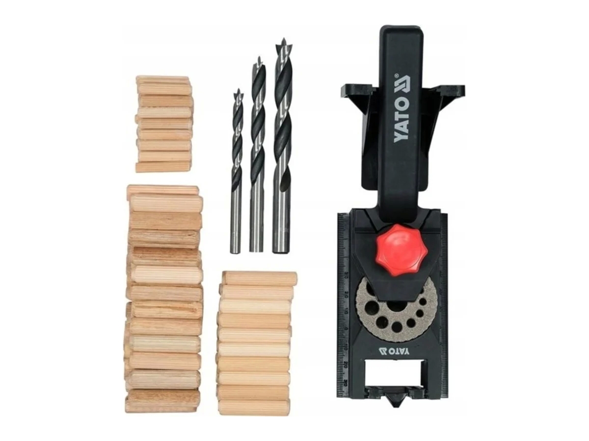 - В комплекте: направляющая с металлическим шаблоном для сверления отверстий, угловой упор, спиральное сверло по дереву (Ø6 мм, Ø8 мм, Ø10 мм)