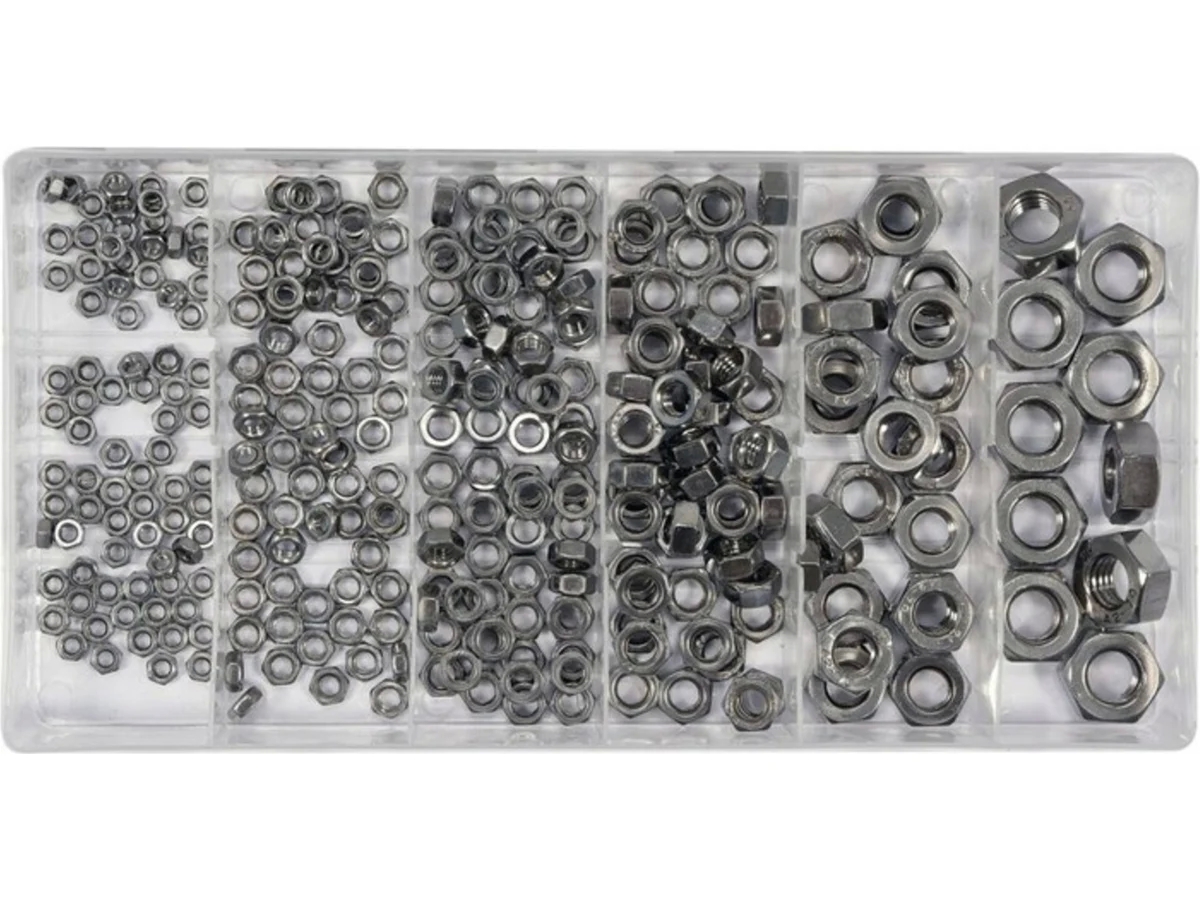 Набор из 300 штук метрических гаек из нержавеющей стали. Включает размеры M3, M4, M5, M6, M8, M10. Для удобства использования, все гайки помещены в удобную упаковку типа «сортировщик».