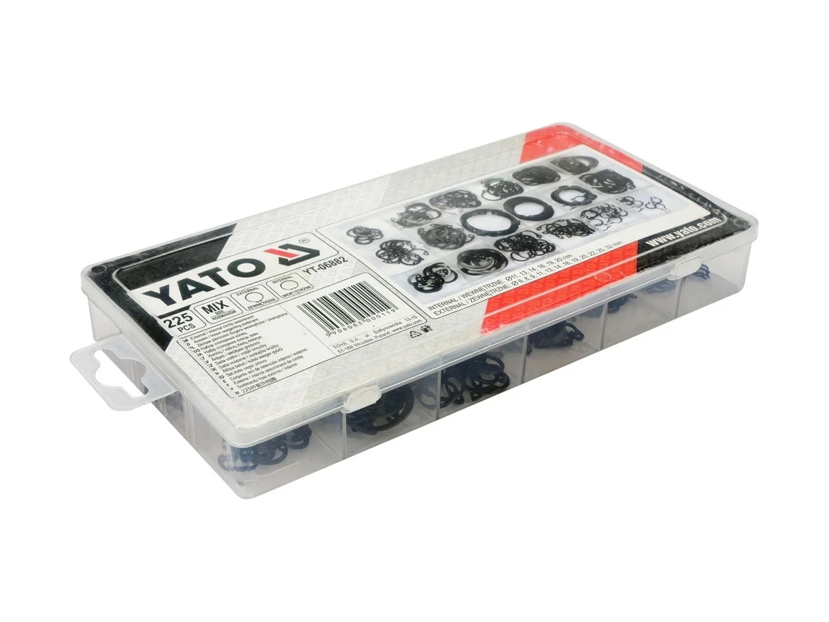Набор стопорных колец YATO 225 шт. YT-06882 - набор из 225 штук внешних и внутренних колец Сегера. В набор входят размеры от 6 мм до 32 мм. Поставляется в удобной упаковке типа «сортировщик».