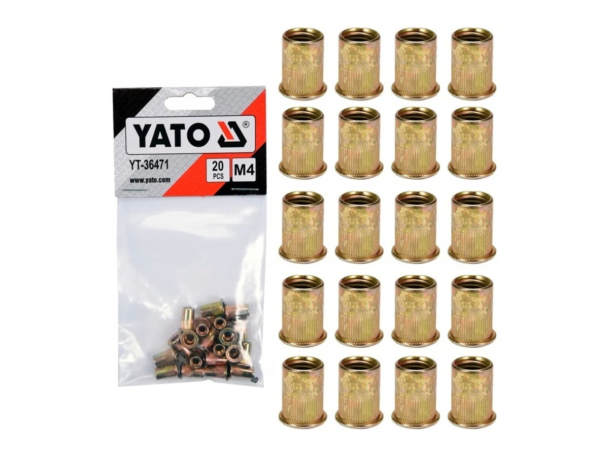 Резьбовая заклепка YATO сталь, М4, 20 шт. YT-36471 позволяет вкручивать винт или болт с метрической резьбой в листовой металл или другие материалы, где невозможно нарезать резьбу. Цилиндрический фланец с накаткой, благодаря чему он более плотно прилегает к закрепляемому элементу. Внешний диаметр: 5.9 мм.