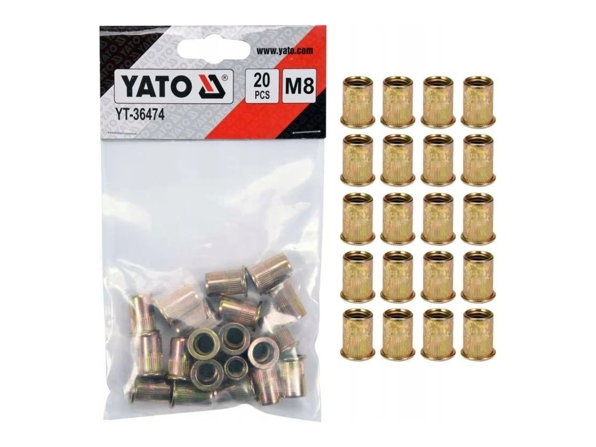 Резьбовая заклепка YATO сталь М8 20 шт YT-36474 позволяет ввинтить винт или болт с метрической резьбой в листовой металл или другие материалы, где нет возможности сделать резьбу.