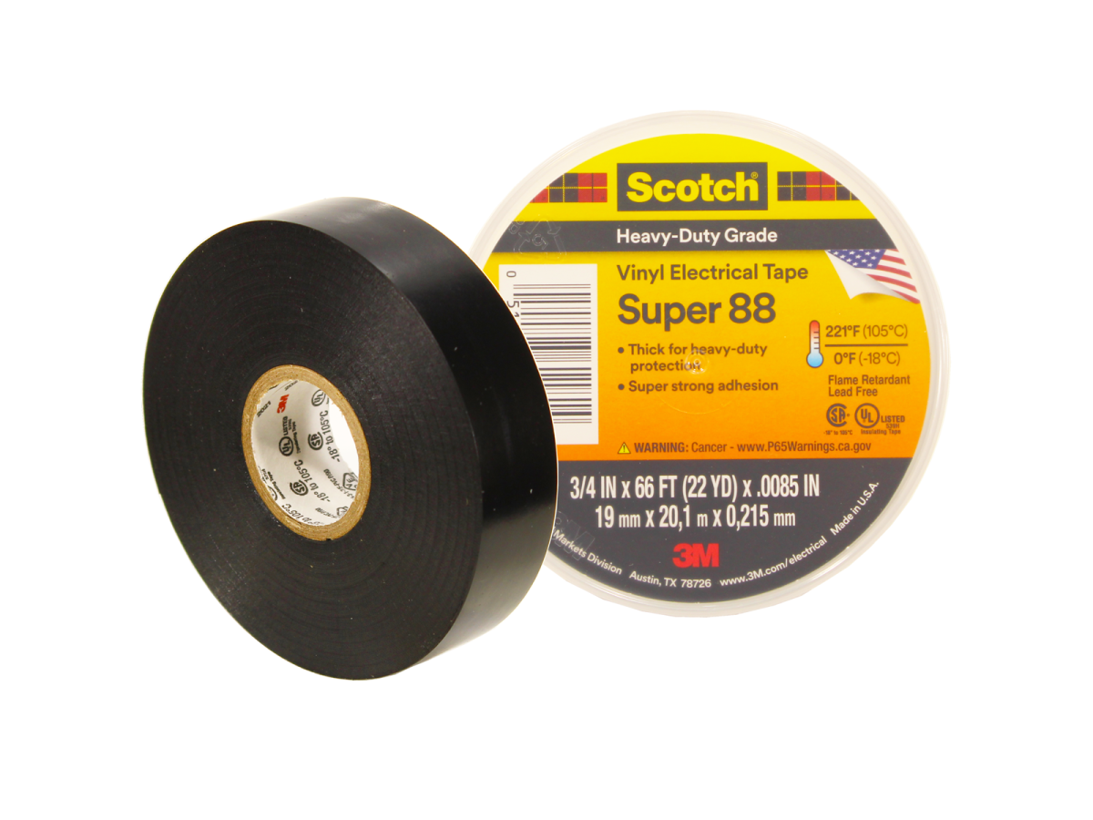Лента Scotch ® Super 88 отличается повышенной стойкостью к истиранию, к воздействию абразивных материалов, влаги, щелочей, кислот, коррозии, изменяющимся погодным условиям, включая ультрафиолетовое излучение. Комбинация эластичной подложки и эффективного адгезивного слоя обеспечивает влагонепроницаемую электрическую и механическую защиту при минимальном объеме намотки. Лента предназначена для первичной электроизоляции (особенно при низких температурах), жгутирования проводов и кабельных соединений напряжением до 600 В при температуре до 105 °C.