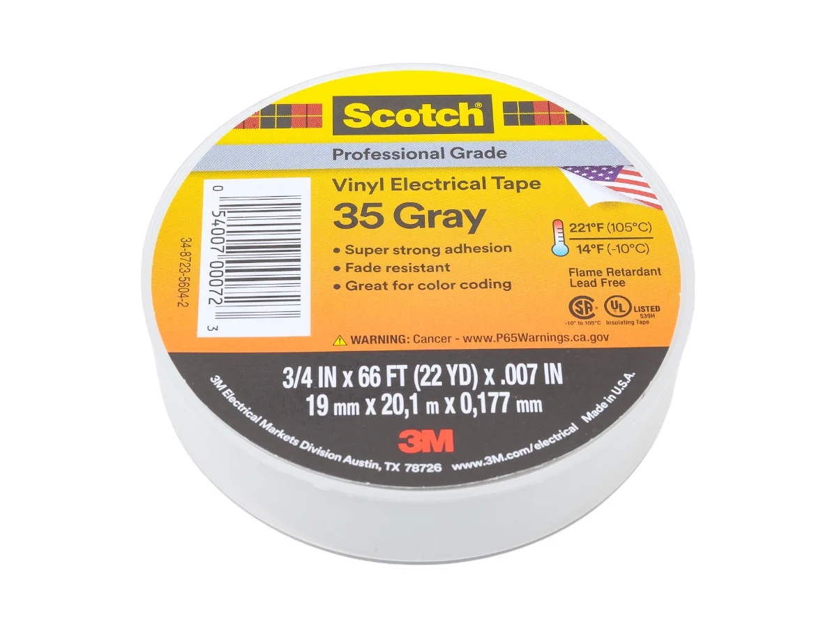 Изоляционная лента высшего класса 3М Scotch 35 серая 19мм х 20м х 0,18мм 7000031674 предназначена для внутренних профессиональных работ. Изделие служит для изоляции провода или разметки кабелей по цветам. Основа изготовлена из ПВХ с клеевым слоем. Лента не поддерживает горение, но не устойчива к УФ.