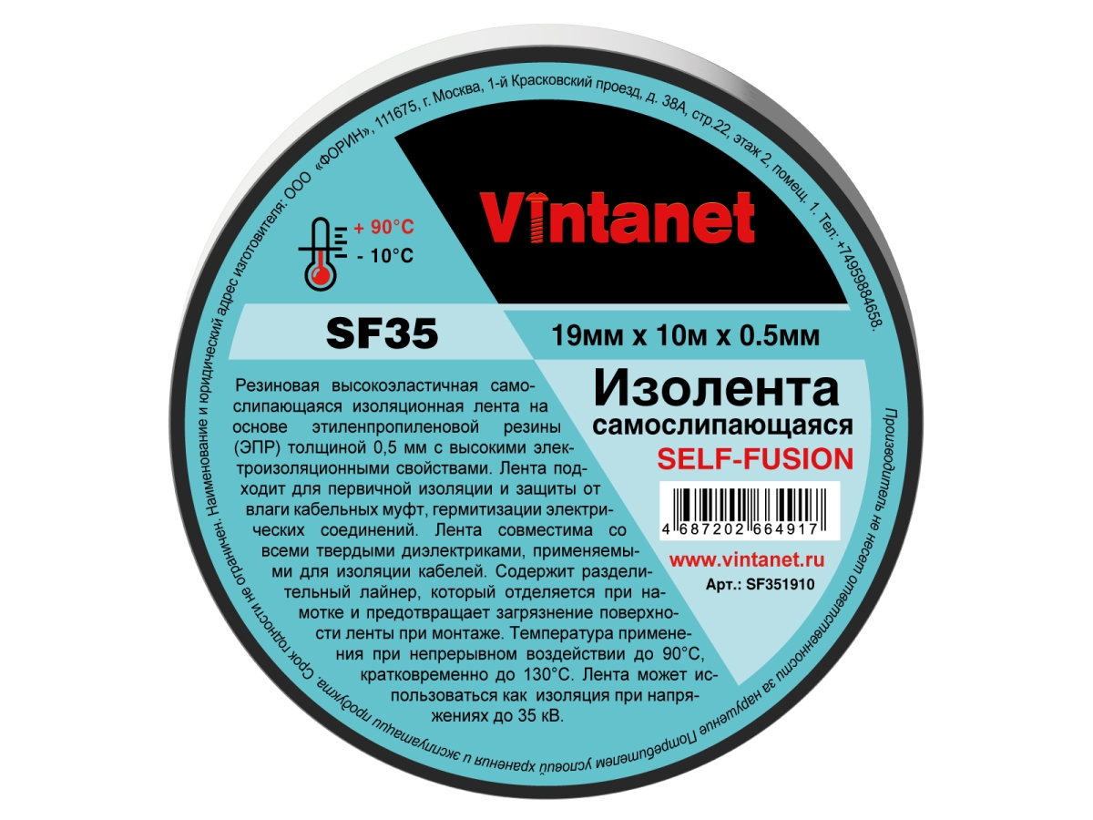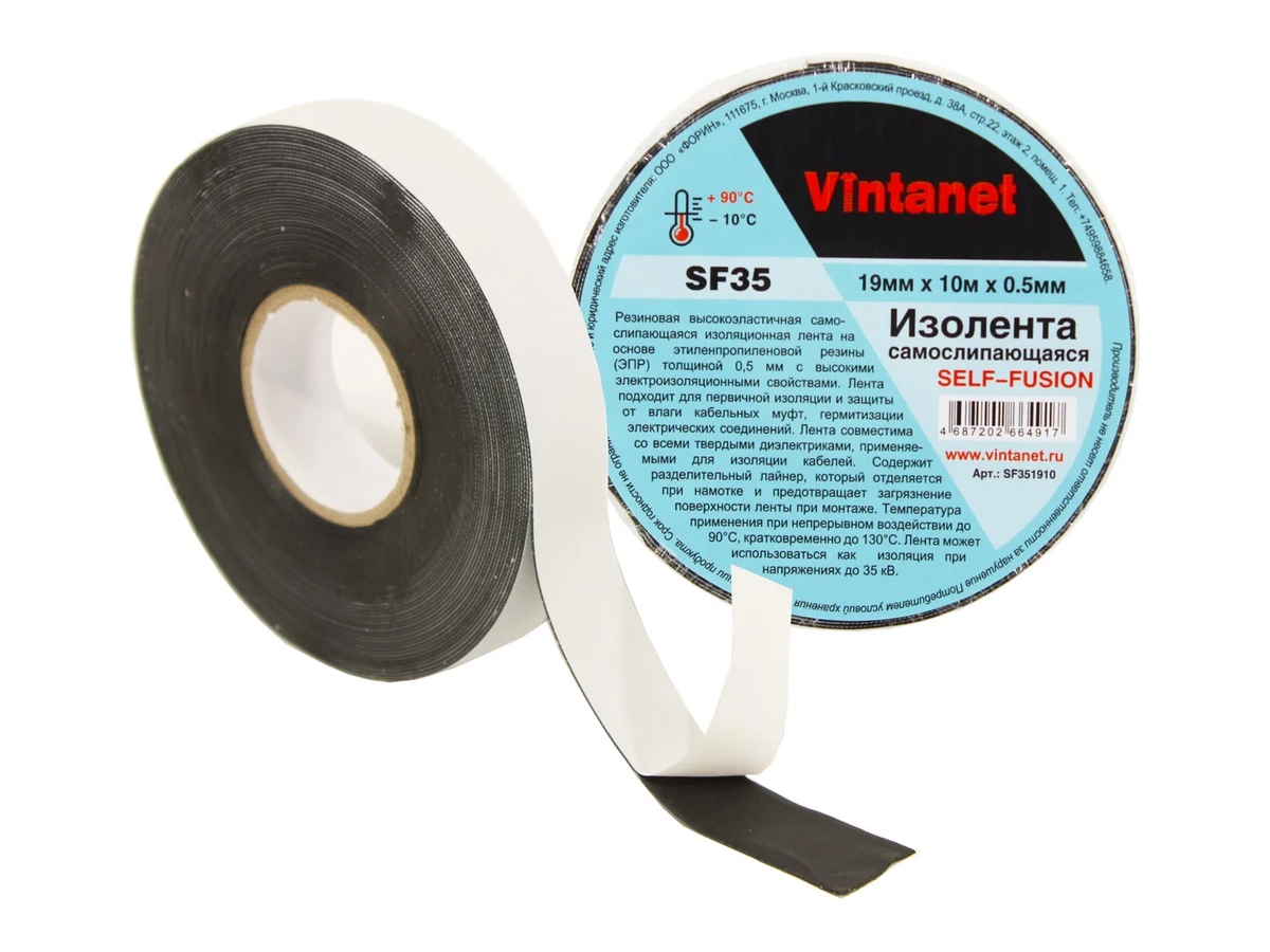 Самослипающаяся изолента Vintanet SF35, 19мм х 10 м х 0,5 мм SF351910 на основе этиленпропиленовой резины (ЭПР), обладает высокими электроизоляционными свойствами. Лента подходит для первичной изоляции и защиты от влаги кабельных муфт, электрошин, герметизации электрических соединений и для концевого уплотнения высоковольтных кабелей. Предохраняет проводку от росы, воды, солевых осадков и окисления. Самовулканизирующаяся изоляционная лента совместима со всеми твердыми диэлектриками, применяемыми для изоляции кабелей. Содержит разделительный лайнер, который отделяется при намотке и предотвращает загрязнение поверхности ленты при монтаже. Температура эксплуатации продукта от -10С до 90С, возможны кратковременные нагрузки до 130С. Лента может использоваться как изоляция на высоковольтных линиях при напряжении до 35кВ.