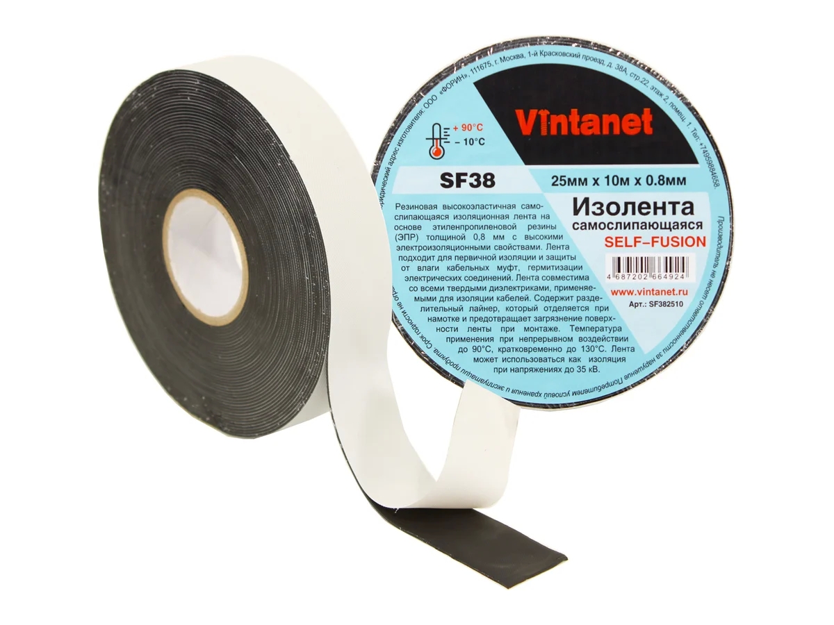 Самослипающаяся изолента Vintanet SF38, 25мм х 10 м х 0,8 мм SF382510 на основе этиленпропиленовой резины (ЭПР), обладает высокими электроизоляционными свойствами. Лента подходит для первичной изоляции и защиты от влаги кабельных муфт, электрошин, герметизации электрических соединений и для концевого уплотнения высоковольтных кабелей. Предохраняет проводку от росы, воды, солевых осадков и окисления. Самовулканизирующаяся изоляционная лента совместима со всеми твердыми диэлектриками, применяемыми для изоляции кабелей. Содержит разделительный лайнер, который отделяется при намотке и предотвращает загрязнение поверхности ленты при монтаже. Температура эксплуатации продукта от -10С до 90С, возможны кратковременные нагрузки до 130С. Лента может использоваться как изоляция на высоковольтных линиях при напряжении до 35кВ.