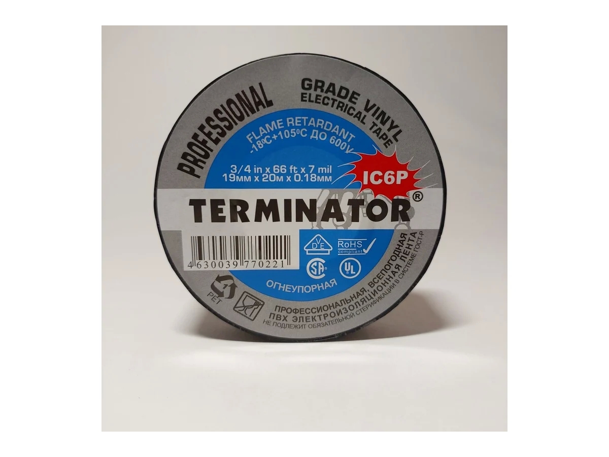 Устойчивая к воздействию огня, холода, погодных условий, большинству химических реагентов ПВХ лента. Толщина 0,18 мм, ширина 19 мм, длина 20 м. Максимальное удлинение 285%(23°С)/112%(0°С). Сопротивление изоляции 10⁶ Ом/см. Номинальное напряжение 600V. Температура эксплуатации от -18°С до +105°С. Самозатухающая. Всепогодная.