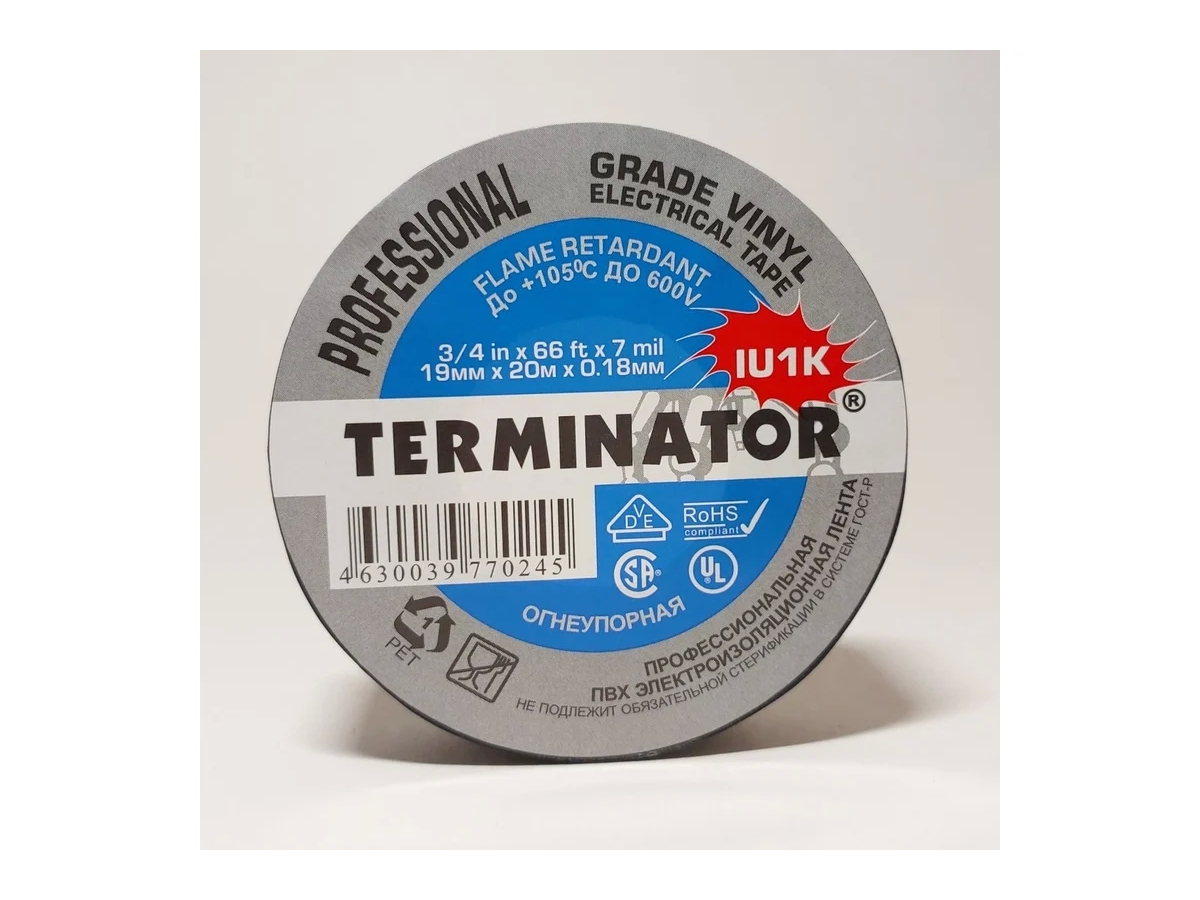 Устойчивая к воздействию огня, холода, погодных условий, большинству химических реагентов ПВХ лента. Толщина 0,18 мм, ширина 19 мм, длина 20 м. Максимальное удлинение 285%(23°С)/112%(0°С). Сопротивление изоляции 10⁶ Ом/см. Номинальное напряжение 600V. Температура эксплуатации до 105°С. Самозатухающая.
