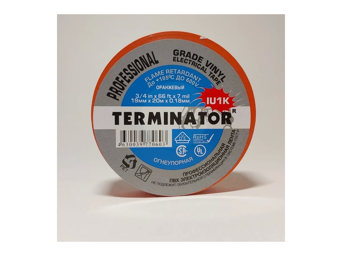 Устойчивая к воздействию огня, холода, погодных условий, большинству химических реагентов ПВХ лента. Толщина 0,18 мм, ширина 19 мм, длина 20 м. Максимальное удлинение 285%(23°С)/112%(0°С). Сопротивление изоляции 10⁶ Ом/см. Номинальное напряжение 600V. Температура эксплуатации до 105°С. Самозатухающая.