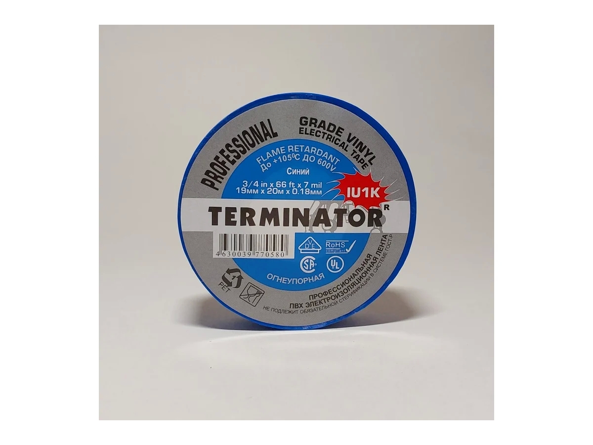 Устойчивая к воздействию огня, холода, погодных условий, большинству химических реагентов ПВХ лента. Толщина 0,18 мм, ширина 19 мм, длина 20 м. Максимальное удлинение 285%(23°С)/112%(0°С). Сопротивление изоляции 10⁶ Ом/см. Номинальное напряжение 600V. Температура эксплуатации до 105°С. Самозатухающая.