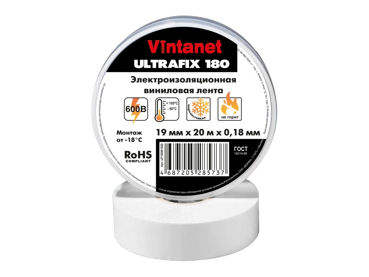Лента Vintanet Ultrafix 180 (аналог 3М Scotch super 33+) виниловая изоляционная лента толщиной 0,18 мм, предназначена для постоянного использования при температуре окружающей среды от -50°С до 105°С. Обеспечивает возможность монтажа в диапазоне температур от -18°С до 38°С без ухудшения физических характеристик. Обладает высокой устойчивостью к истиранию, воздействию влаги, щелочей, кислот, коррозии и изменяющимся условиям окружающей среды (включая УФ - излучения). Комбинация эластичной основы и эффективного адгезионного слоя обеспечивает влагонепроницаемую электрическую и механическую защиту при минимальном объеме намотки.