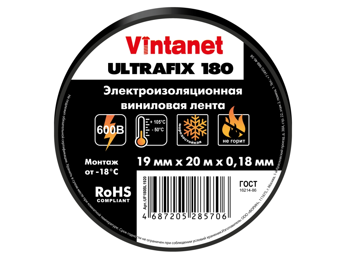 Лента Vintanet Ultrafix 180 (аналог 3М Scotch super 33+) виниловая изоляционная лента толщиной 0,18 мм, предназначена для постоянного использования при температуре окружающей среды от -50°С до 105°С. Обеспечивает возможность монтажа в диапазоне температур от -18°С до 38°С без ухудшения физических характеристик. Обладает высокой устойчивостью к истиранию, воздействию влаги, щелочей, кислот, коррозии и изменяющимся условиям окружающей среды (включая УФ - излучения). Комбинация эластичной основы и эффективного адгезионного слоя обеспечивает влагонепроницаемую электрическую и механическую защиту при минимальном объеме намотки.