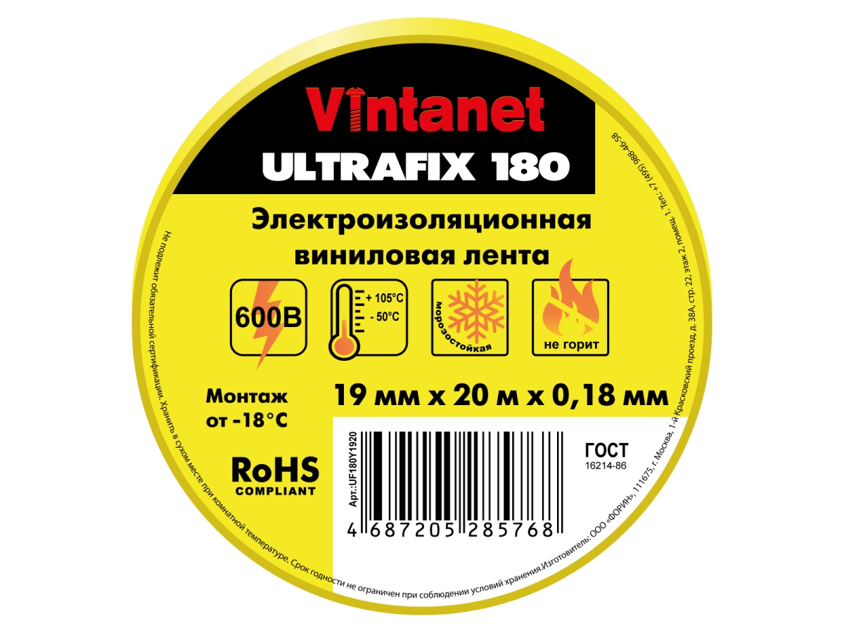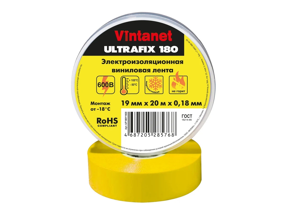 Лента Vintanet Ultrafix 180 (аналог 3М Scotch super 33+) виниловая изоляционная лента толщиной 0,18 мм, предназначена для постоянного использования при температуре окружающей среды от -50°С до 105°С. Обеспечивает возможность монтажа в диапазоне температур от -18°С до 38°С без ухудшения физических характеристик. Обладает высокой устойчивостью к истиранию, воздействию влаги, щелочей, кислот, коррозии и изменяющимся условиям окружающей среды (включая УФ - излучения). Комбинация эластичной основы и эффективного адгезионного слоя обеспечивает влагонепроницаемую электрическую и механическую защиту при минимальном объеме намотки.
