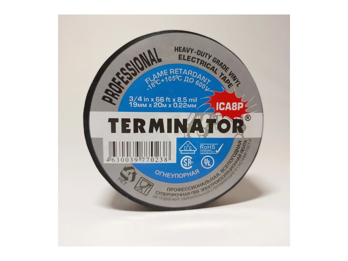 Устойчивая к воздействию огня, холода, погодных условий, большинству химических реагентов ПВХ лента. Толщина 0,22 мм, ширина 19 мм, длина 20 м. Максимальное удлинение 298%(23°С)/124%(0°С). Сопротивление изоляции 10⁶ Ом/см. Номинальное напряжение 600V. Температура эксплуатации от -18°С до +105°С. Самозатухающая. Всепогодная