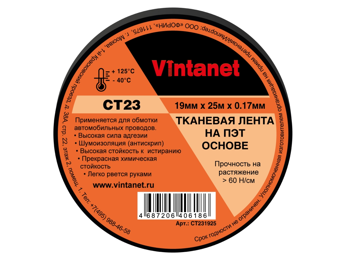 CT23 Vintanet лента используется исключительно для обмотки автомобильных жгутов проводов. Обладает сильной устойчивостью к загрязнениям и высоким температурам, а наиболее выдающейся особенностью этой клеющей ленты на тканевой основе из химического волокна является ее высокая стойкость к истиранию. Таким образом, тканевая лента из химического волокна обычно используется для обмотки деталей двигателя, аккумулятора и жгута проводов.