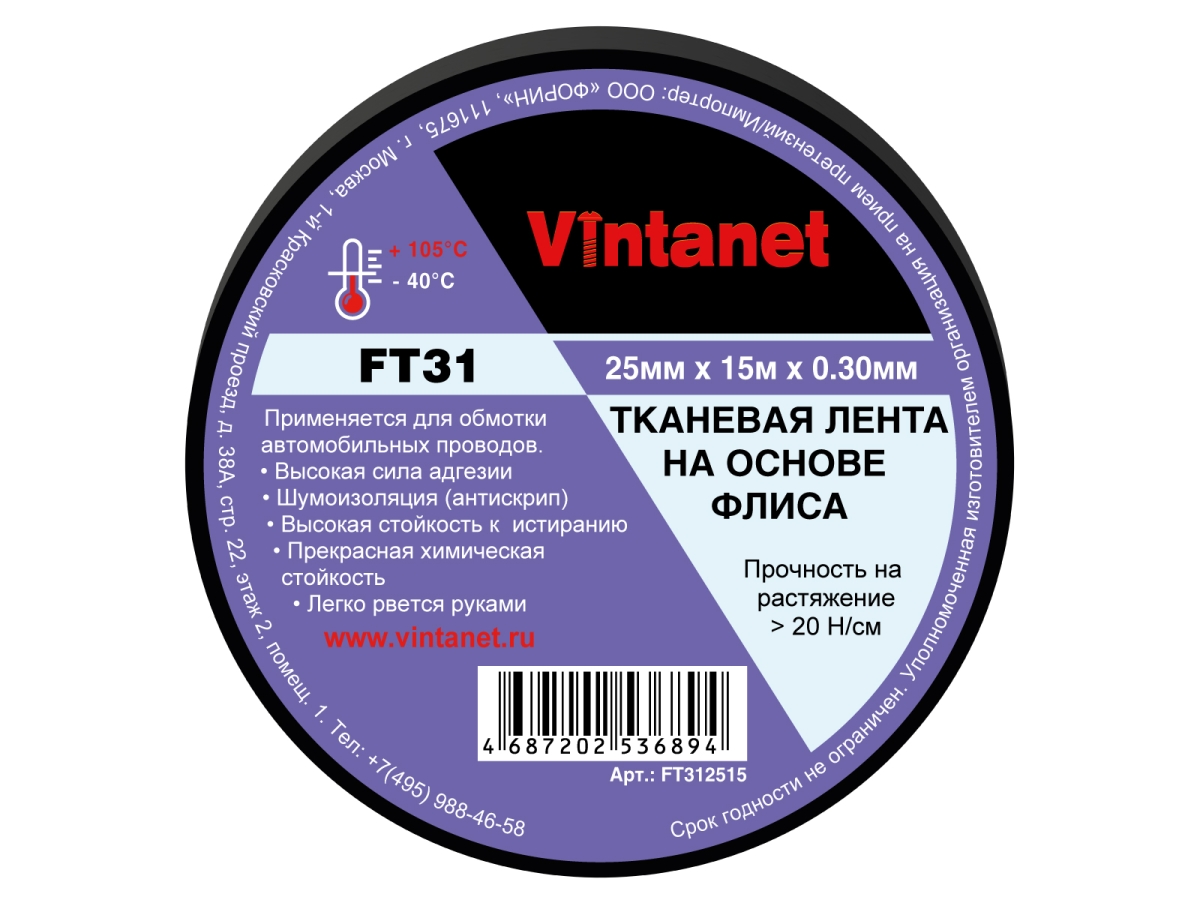 Тканевая лента на основе флиса VINTANET FT31 25 мм, 15 м FT312515 применяется исключительно для обмотки автомобильных жгутов проводки. Из-за мягкого материала основы, флисовая лента особенно подходит для внутренних жгутов проводов автомобиля и может сохранять мягкость и гибкость жгута проводов. Более того, она обладает высокой стойкостью к истиранию и шумам, а также имеет выдающиеся показатели адгезии и прочности на растяжение.