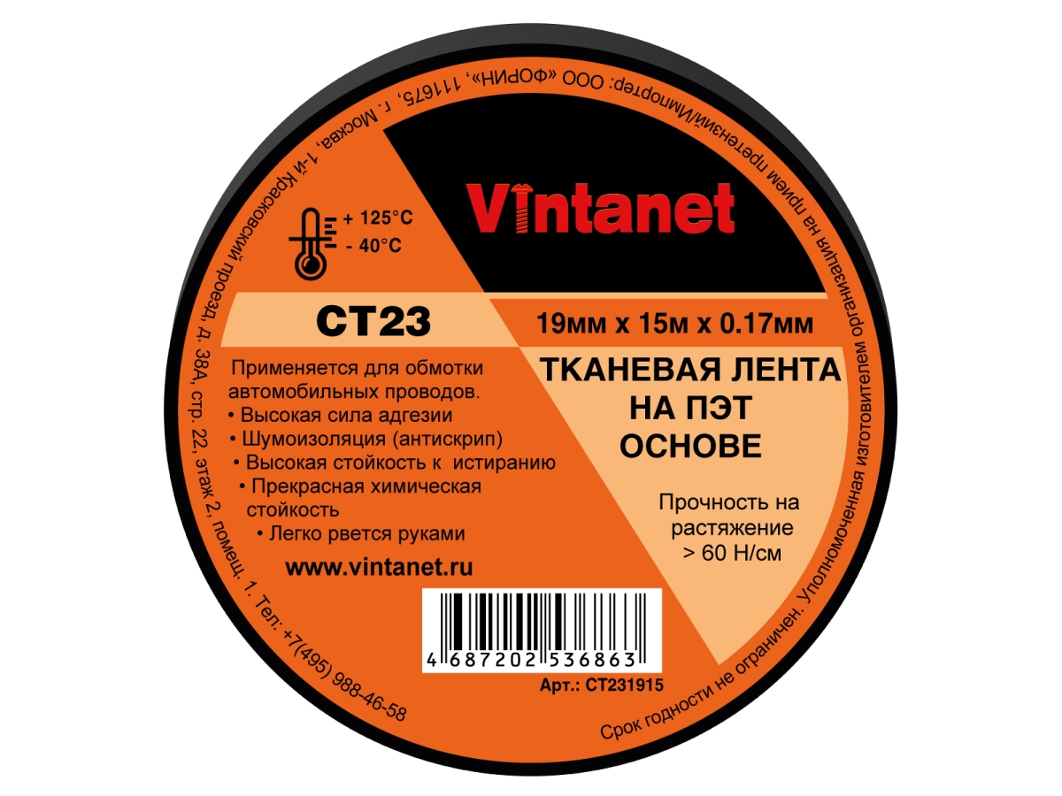 Тканевая лента на ПЭТ основе VINTANET CT23, 19 мм, 15 м CT231915 используется исключительно для обмотки автомобильных жгутов проводов. Обладает сильной устойчивостью к загрязнениям и высоким температурам, а наиболее выдающейся особенностью этой клеящей ленты на тканевой основе из химического волокна является ее высокая стойкость к истиранию.
