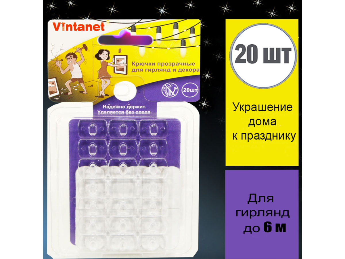 Крючки для гирлянд и декора VINTANET прозрачные, 20 шт./упак. 13026 - это уникальная адгезивная технология для легкого, надежного и безопасного крепления на вертикальной поверхности.