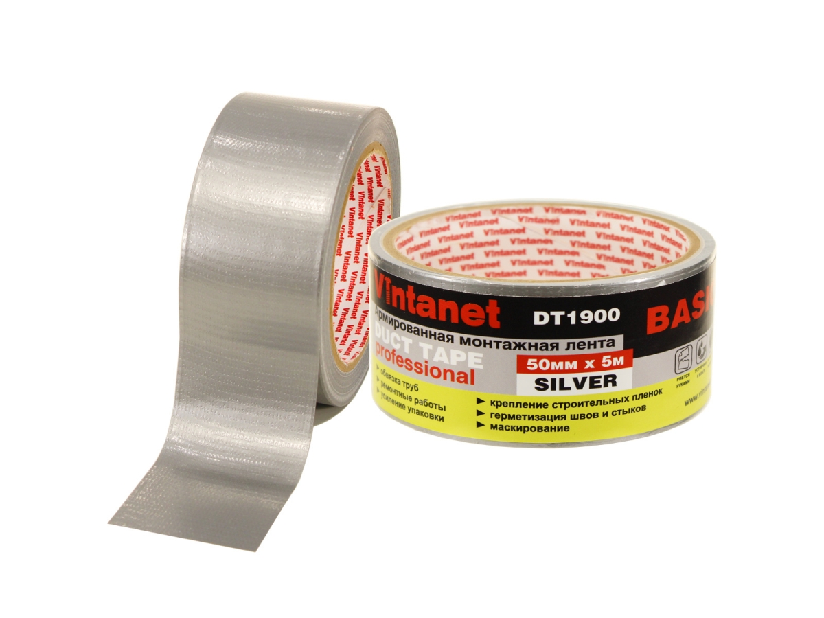 Монтажная армированная лента VINTANET DT1900 базовая, серебряная, 50 мм, 5 м DT1900505S устойчива к истиранию и к влаге, легко рвется руками. Применяется для ремонтных работ, обвязки труб, крепления ковров, герметизации швов и стыков воздуховодов систем кондиционирования, маскирования, крепления строительных пленок, крепления упаковки.