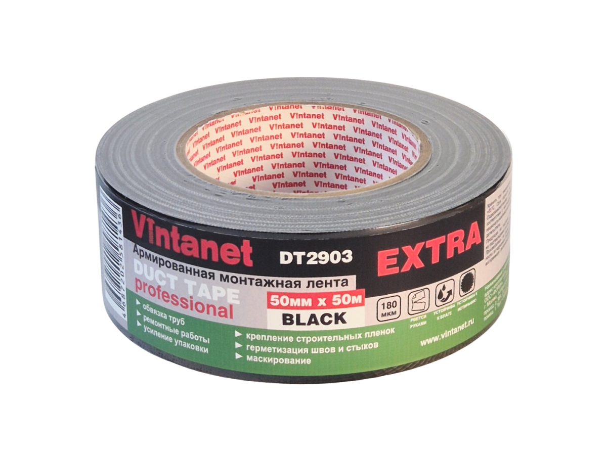 Монтажная армированная лента VINTANET DT2903 ЭКСТРА, черная, 50 мм, 50 м DT29035050B устойчива к истиранию и к влаге, легко рвется руками. Применяется для ремонтных работ, обвязки труб, крепления ковров, герметизации швов и стыков воздуховодов систем кондиционирования, маскирования, крепления строительных пленок, крепления упаковки.