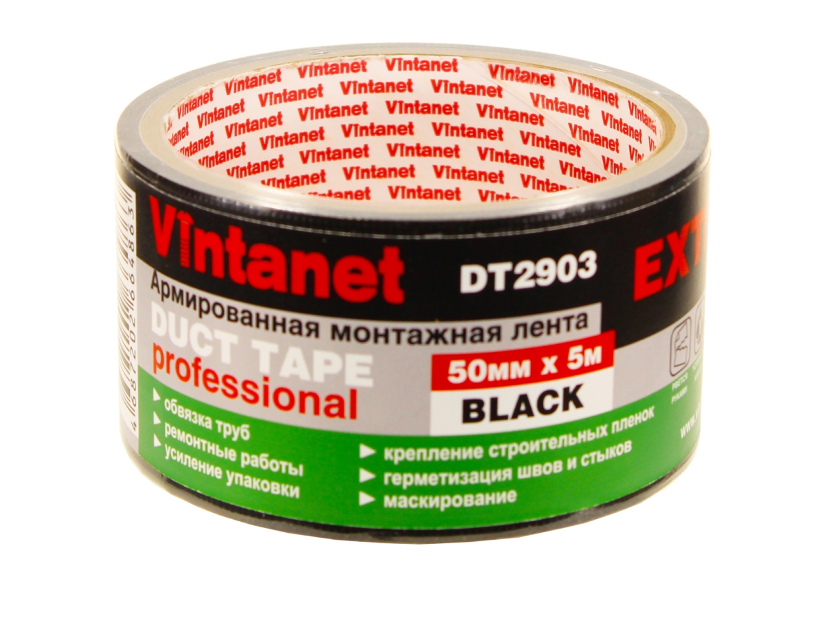 Монтажная армированная лента Vintanet DT2903 ЭКСТРА, черная, 50 мм х 5 м DT2903505B - тканевая лента с полиэтиленовым покрытием. Клеевое покрытие - синтетический каучук. Устойчива к истиранию и к влаге. Легко рвется руками. Применяется в ремонтных работах, для обвязки труб, крепления ковров, герметизации швов и стыков воздуховодов систем кондиционирования, маскирования, крепления строительных пленок, крепления упаковки.