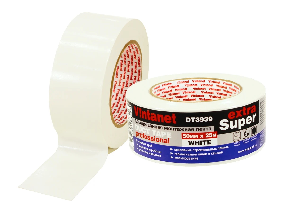 Монтажная армированная лента Vintanet DT3939 ЭКСТРА СУПЕР, белая, 50 мм х 25 м DT39395025W - тканевая лента с полиэтиленовым покрытием. Клеевое покрытие - синтетический каучук. Устойчива к истиранию и к влаге. Легко рвется руками. Применяется в ремонтных работах, для обвязки труб, крепления ковров, герметизации швов и стыков воздуховодов систем кондиционирования, маскирования, крепления строительных пленок, крепления упаковки.