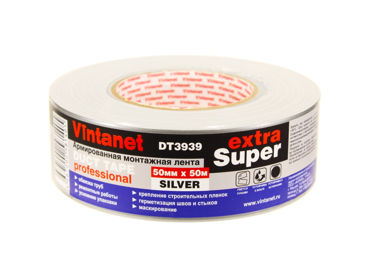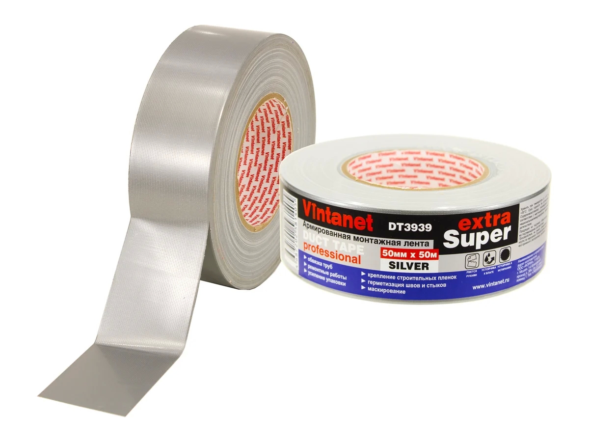 Монтажная армированная лента Vintanet DT3939 ЭКСТРА СУПЕР, серебряная, 50 мм х 50 м DT39395050S - тканевая лента с полиэтиленовым покрытием. Клеевое покрытие - синтетический каучук. Устойчива к истиранию и к влаге. Легко рвется руками. Применяется в ремонтных работах, для обвязки труб, крепления ковров, герметизации швов и стыков воздуховодов систем кондиционирования, маскирования, крепления строительных пленок, крепления упаковки.