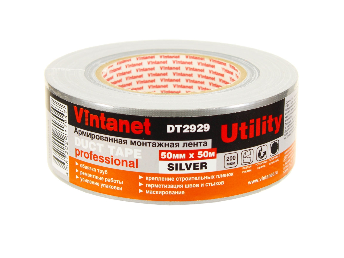 Универсальная армированная монтажная лента VINTANET DT2929 серебряная, 50 мм х 50 м DT29295050S – высококачественная тканевая лента с полиэтиленовым покрытием. Клеевое покрытие - синтетический каучук. Устойчива к истиранию и к влаге. Легко рвется руками.
