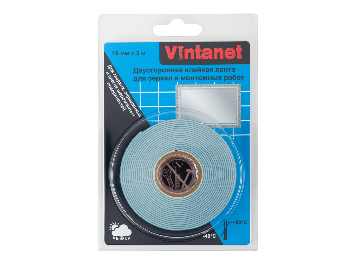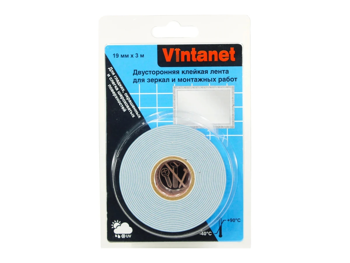 Двусторонняя клейкая лента для зеркал и монтажных работ Vintanet VN819, 19 мм х 3 м VN819193 с хорошей адгезией к гладким, окрашенным и слегка шероховатым поверхностям. С ее помощью можно соединять комбинации: металлы, различные пластики, шлифованное дерево, окрашенные поверхности, зеркальные и стеклянные поверхности (не повреждает амальгаму), кафель и др. Самоклеящаяся клейкая лента поглощает вибрацию и компенсирует температурные изменения соединяемых поверхностей, твердо реагирует на сдвиг. Имеет уверенную прочность на разрыв, устойчивость к пластификаторам, погодному воздействию, старению и УФ-излучению. Вспененная основа сохраняет постоянную эластичность и не желтеет.
